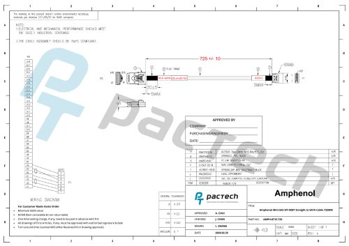 Amphenol SFF8087 Straight mini SAS to No-Latched SATA Cable – 725MM