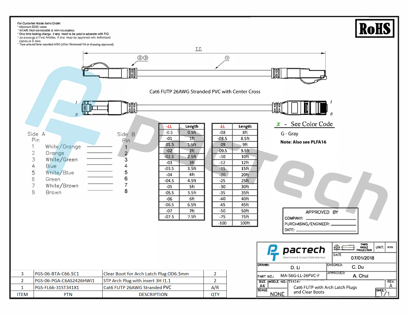 This cable is made of 26AWG with 100% stranded copper wires. They are fully compliant with UL Code 444 and National Electrical Code EIA/TIA-568-C.2 fire & safety standards. The connectors use T568B pin assignments.